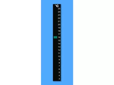 Самоклеящийся гибкий термометр предназначен для измерения температуры поверхности, на которой закреплен. Принцип работы термометра основан на свойстве некоторых веществ, изменять свою кристаллическую структуру при нагревании, и как следствие цвет. Состоит из гибкой подложки на полимерной основе, с тыльной стороны полосы нанесено клеящееся вещество.
